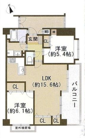 | 間取り | 2LDK | 間取り内訳 | LDK15.6畳×1室 洋6.1畳×1室 洋5.4畳×1室 |