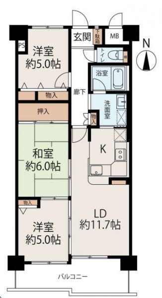 | 間取り | 3LDK | 間取り内訳 | 5畳×2室 6畳×1室 11.7畳×1室 |